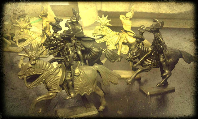 The standing figures come separate from the bases and little pegs at the solesof the feet plug into the bases. The horses are mounted thru a peg on their bellies.
